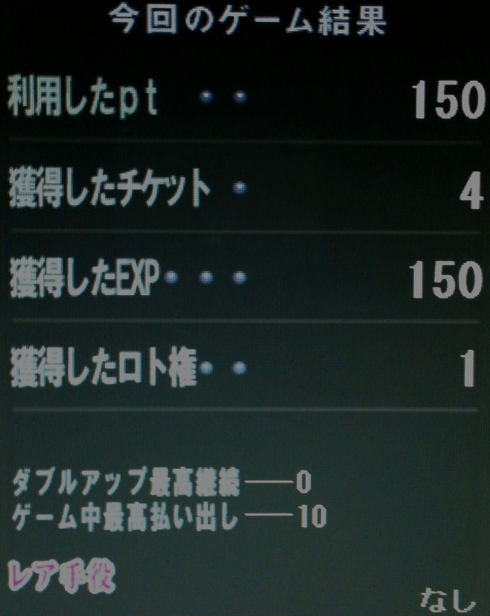 ポーカーのバトルエリアで150ポイント分のプレイ結果です。 条件 1ゲーム1ポイント使用 ダブルアップ無し 特に攻略法無し。 課金経験無し。 結果 獲得チケット 4枚 獲得EXP 150 残りメダル 0枚 獲得ロト権 1