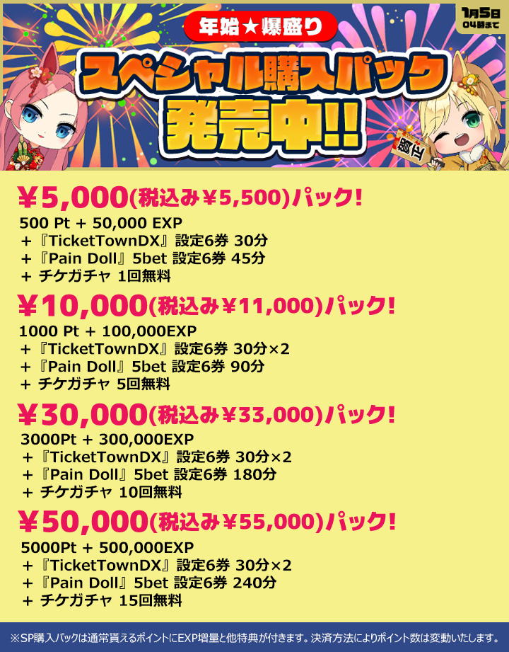 ※SP購入パックは通常貰えるポイントにEXP増量と設定券が付きます。