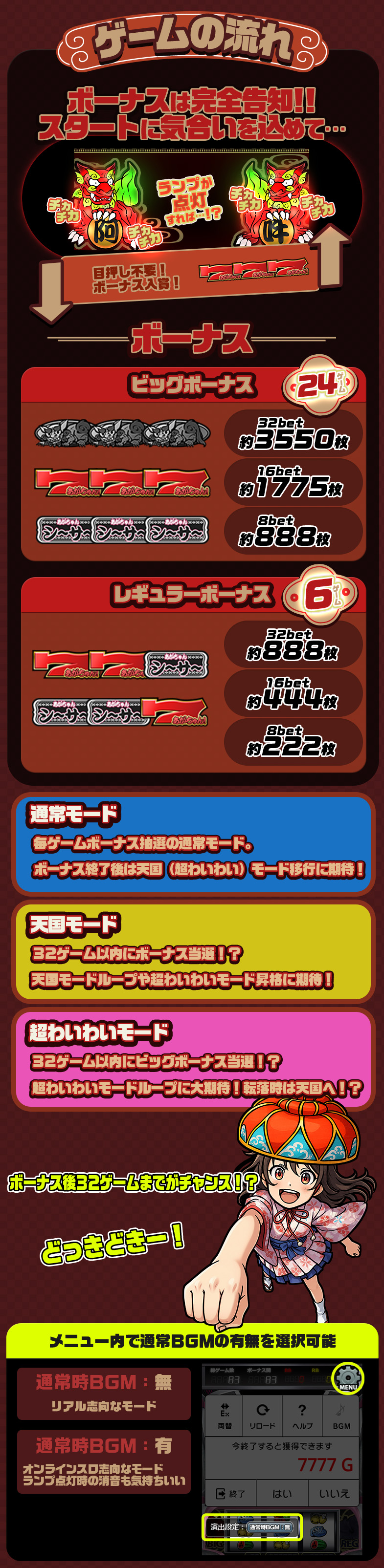 機種のスペックや、省電力モード等の性能を制限する機能がONの場合、リール停止や演出が正常に表示されない可能性がございます。