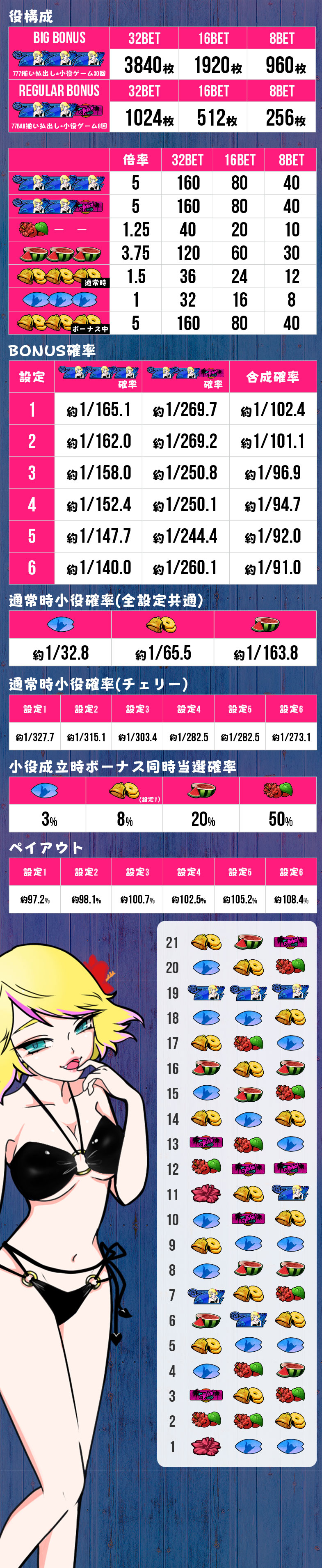 各絵柄が揃った時の配当が表示されます。
